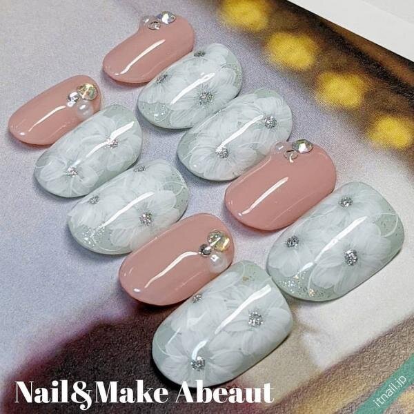 ホワイト強めな淡いグレーの上に、大輪の花を爪いっぱいに描いた華やかなデザイン。ホワイトの花がよく映えますね♪ピンク色を合わせれば、グレーの花柄も地味に見えてしまわないので安心。控えめにせず、ビジューも飾ってとことん女子っぽくまとめるのがおすすめです。