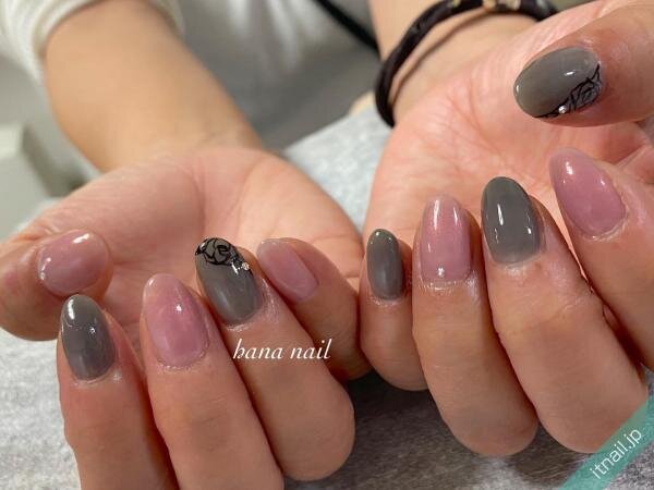 濃いめのグレーに、青みのあるくすみピンク。甘さ控えめなカラーリングにバラを添えれば、女っぽいデザインの完成です!バラはあえて色は付けず、黒で輪郭だけ描くことでモードな雰囲気も出せますよ。ワンポイントで片手につき1本だけ描いて、シンプルに仕上げて。