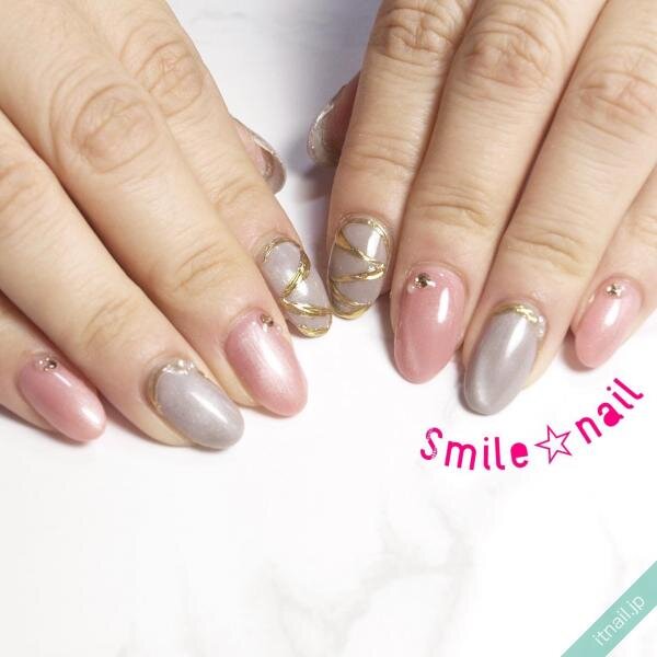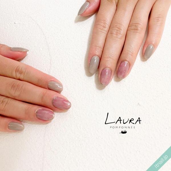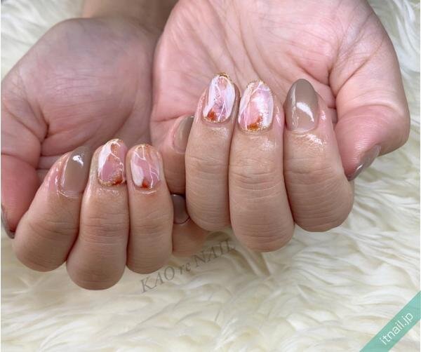 ピンクをベースに、ホワイトやブラウンを混ぜた、天然石風のデザインが目をひくこちら♡甘い雰囲気にもできますが、ここはあえてグレーのグラデーションを合わせて落ち着かせることで、品の良さが生まれます。柄に存在感があるので、ビジューなど立体的なものは入れず、色味で魅せて!