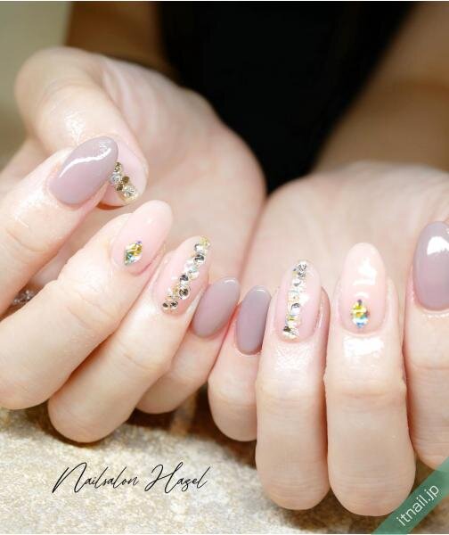 彩度高めな淡いピンクは女性らしさを引き出すにはもってこいのカラー。お姉さんな雰囲気の淡いグレーと組み合わせて、万人受けするデザインに仕上げましょう。単色塗りでも十分可愛いですが、小粒のビジューを並べれば、華やかに見えますよ。