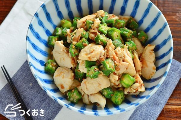 さっぱりいただけるメインメニュー、ささみとオクラの梅おかかポン酢和えです。ささみはレンジで蒸し焼きにして、オクラはサッと茹でてからポン酢におかか、梅ペーストを混ぜた調味料で和えて出来上がり。