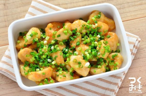 マヨネーズや砂糖も入ることで、ささみがしっとり柔らかく仕上がりますよ。下味をつけた状態で冷凍できるので、作り置きにもおすすめです。フライパンで香ばしく焼いていただきます。ご飯がすすむメインメニューに。