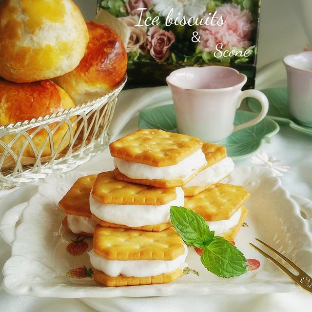 こちらはクラッカーに手作りアイスをサンドして作った人気レシピ。ビスケットでも美味しく作れますよ。
