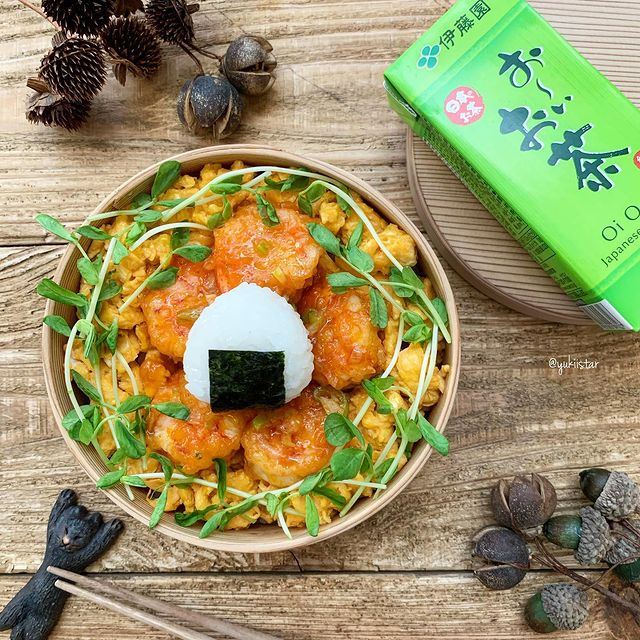 中華系のおかずは子供が喜ぶ料理。美味しいエビチリ丼にプチおにぎりを添えれば、腹ペコ食べ盛りの子供も大満足のお弁当が完成しますよ。