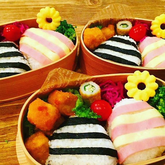 ハムとチーズの組み合わせは洋風のおにぎりになって子供が喜ぶ一品に。華やかに見える作り方なので挑戦してみてくださいね。