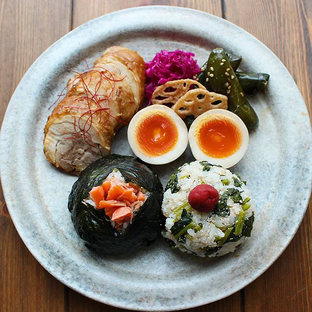 それぞれ違うテイストの手作りおにぎりを乗せて和風プレートにしたレシピです。