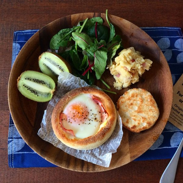 ベーコンエッグマフィンレシピはカフェ風のプレートにできて、ランチがおしゃれに見えます。