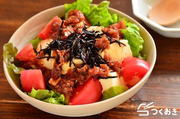 ひじきや豆腐、トマトなどが入った美味しいサラダです。レタスもたっぷりを入れてボリュームを出してくださいね。ヘルシーなおつまみが食べたい時はこのレシピを作りましょう。