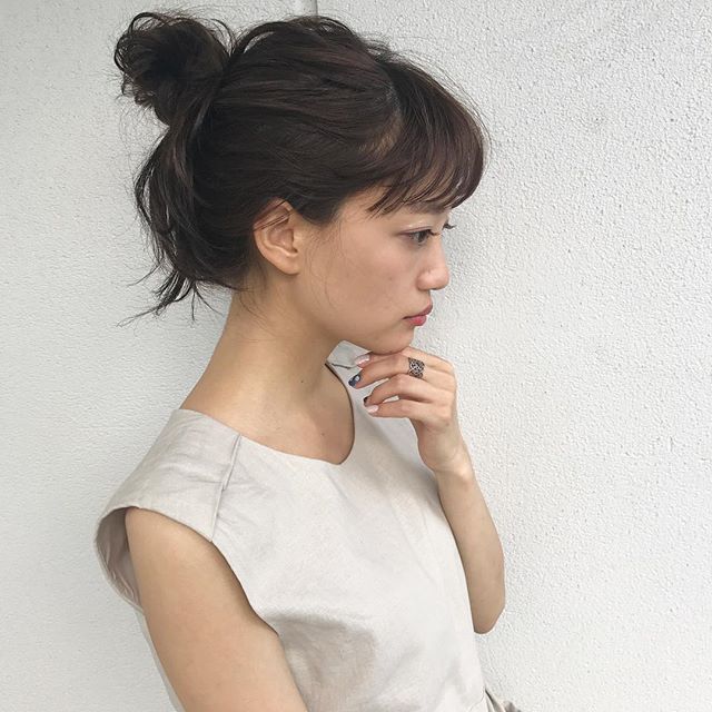 ゆるく引き出したトップと、ふわふわお団子が大人可愛い髪型ですね。