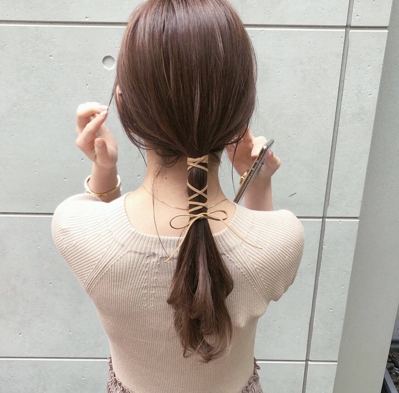 ひとつ結びが一気におしゃれになる紐アレンジ。結び目に紐を巻き付けてリボン結びにするだけで完成です。お気に入りの紐を持っておくと便利ですよ。