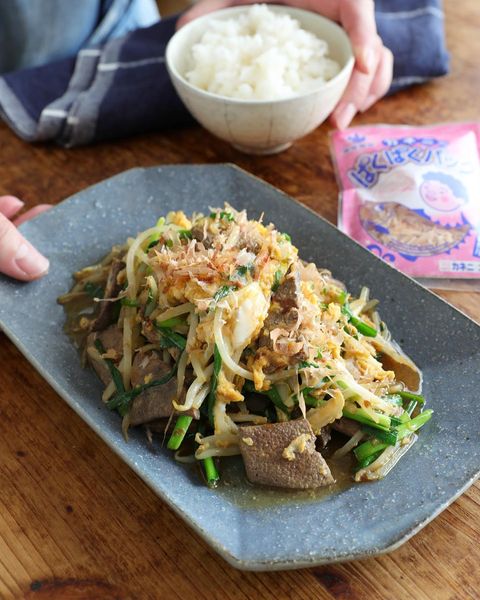 レバニラのアレンジバーションで、卵や鰹節が入っていますよ。
