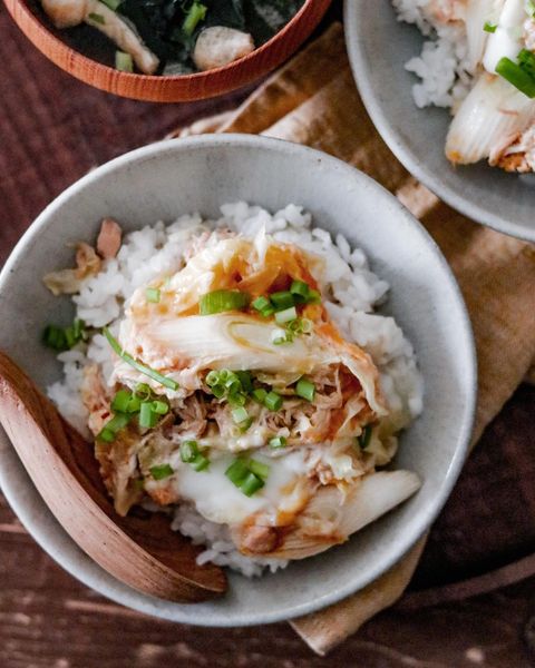 ツナと長ネギ、キャベツを使って作る卵とじ丼。