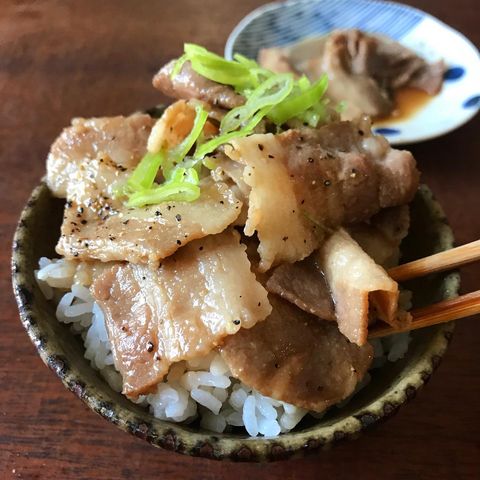 豚肉を焼いて火が通ったらニラをプラスして甘辛たれで絡めたら完成の豚ニラ丼。