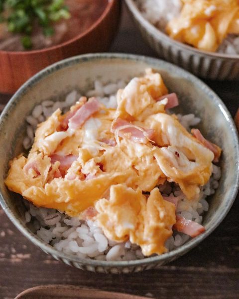 卵とチーズを混ぜたものをフライパンで焼き、ご飯の上にのせるだけの簡単卵チーズ丼。白だしやしょうゆをかけて食べるそうです。