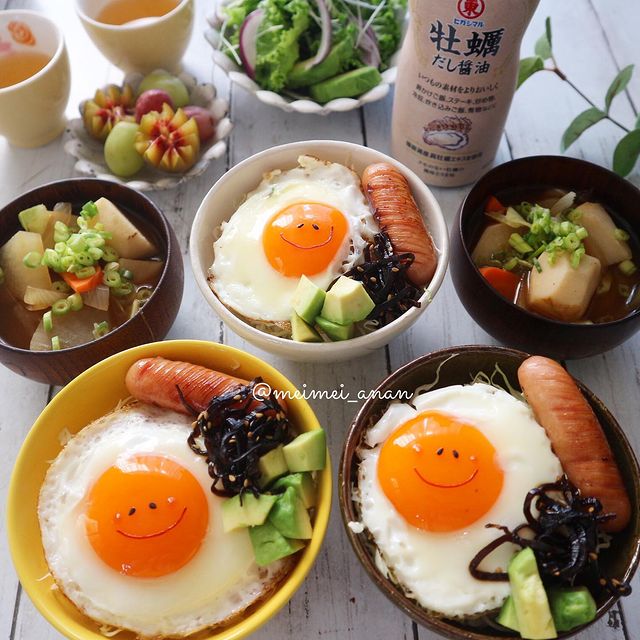 温かいご飯の上に千切りキャベツをのせたあとに目玉焼きをのせ、ウインナーやアボカドなど好きなおかずを盛り付けるだけの簡単丼です。