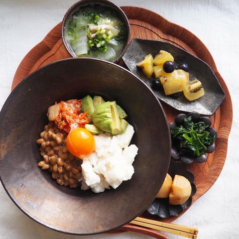 ご飯の上にアボカド、納豆、キムチ、長芋をのせたアボカド納豆丼。食欲がない時でもモリモリ食べられそうですね。
