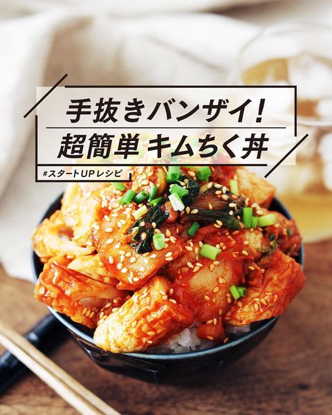 カットしたちくわとキムチを混ぜ合わせて、調味料を入れたら完成の超簡単丼レシピです。