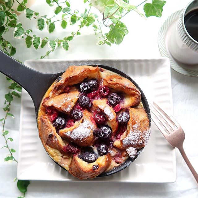 スキレットに盛り付けたパンプティングは、写真に撮りたくなるほどおしゃれな絶品料理ですね。