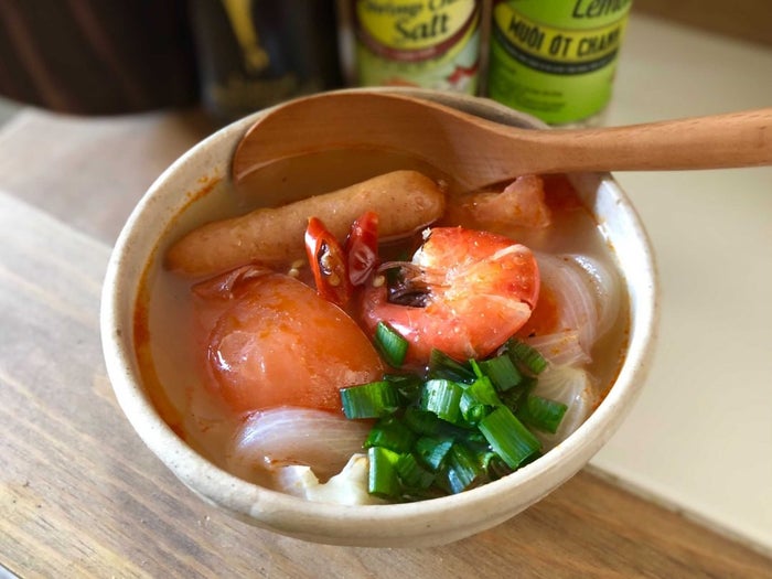 「酸っぱい味が大好きなわたしにとって、トムヤムクンは正義のスープ。味付けが一発で決まる、あのペーストさえあればこっちのものですよ。具材を包丁のいらないミニトマトやきのこにすれば、なかなかのずぼらレシピです」(もちこ)業務スーパーやカルディで買える「トムヤムペースト」を使用