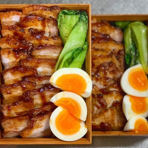 焼き豚だけでは茶色いお弁当になってしまうので、青梗菜やゆで卵などトッピングしてバランスよくしてくださいね。