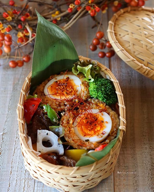 キムチチャーハンのおにぎりを大きく作って、籠のお弁当に入れる盛り付けです。