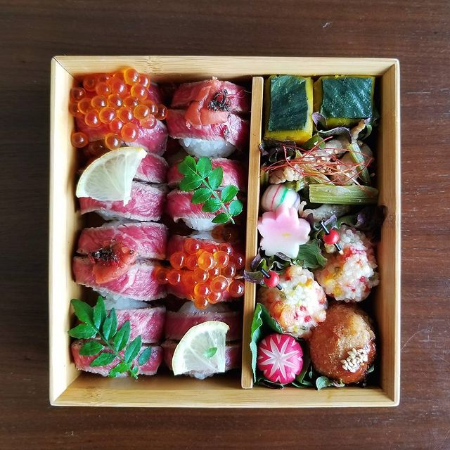 運動会で頑張ってもらうには豪華なお弁当が必須です。小さな牛肉の手まり寿司をいくつも並べておしゃれにした盛り付けに。