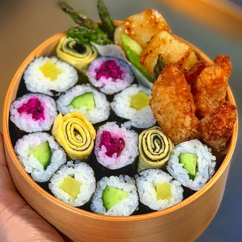 色鮮やかな巻き寿司をお弁当の中に盛り付けるアイデアです。