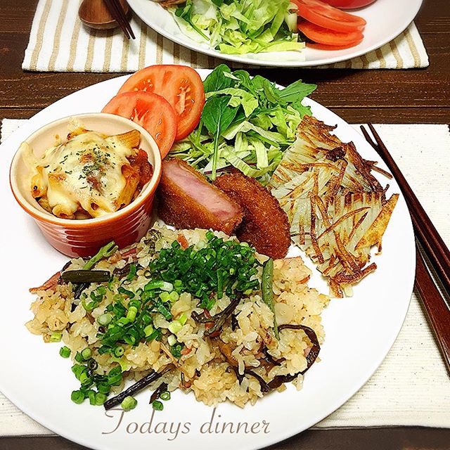 山菜とベーコンのピラフをメインに、じゃがいものガレットやペンネのミートグラタンをセットしたワンプレートの夕食。