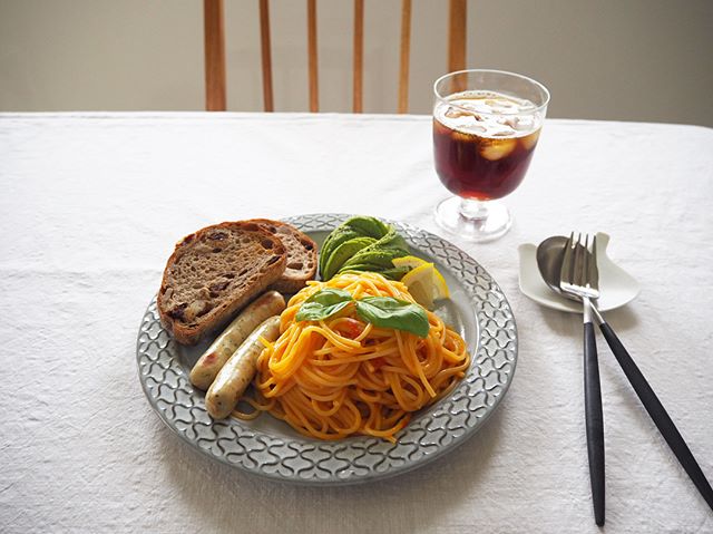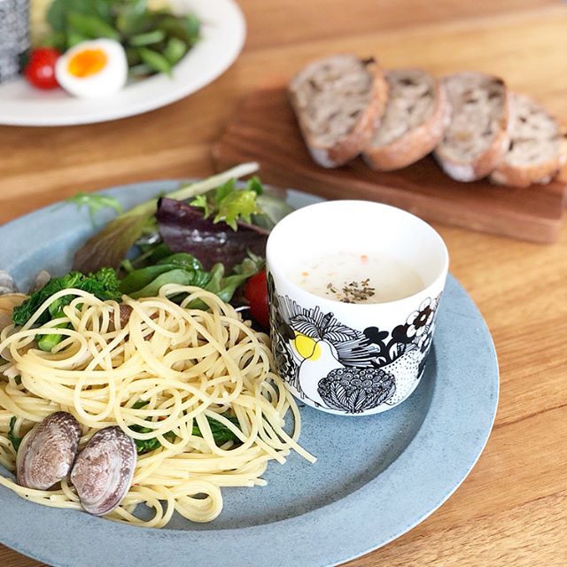 パスタの横に北欧食器のラテマグも一緒に使って、見た目もさらに華やかに。