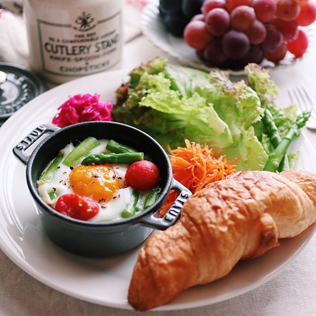 クロワッサンをメインに、ストウブのココットで調理したエッグスラットを添えたバランスの良い朝食メニュー。