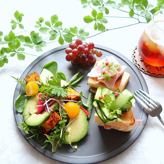 アボカドやサラダ、ぶどうも並べた彩の良いワンプレートの朝ごはんです。黒いプレートが食材の色味を引き立てていますね。