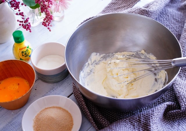 ② 耐熱ボウルにクリームチーズを入れて、レンジで軽く温め(30秒くらい)泡立て器で混ぜて滑らかにして、砂糖を加えてよく混ぜる。