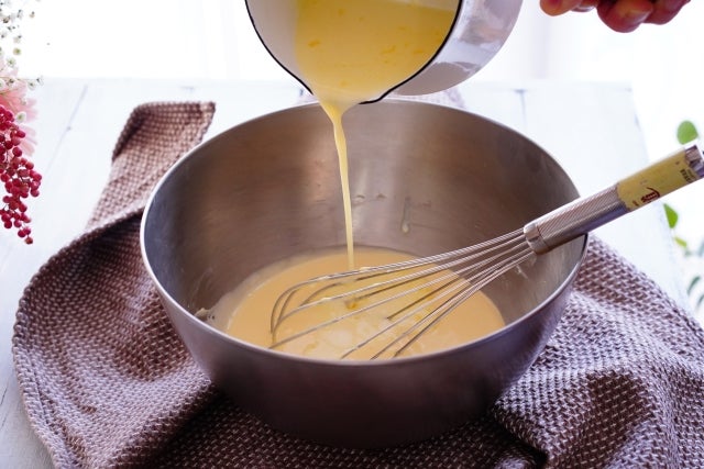 ③ 溶き卵を②に3回くらいに分けて入れてその都度しっかり混ぜる。(分離しないように)