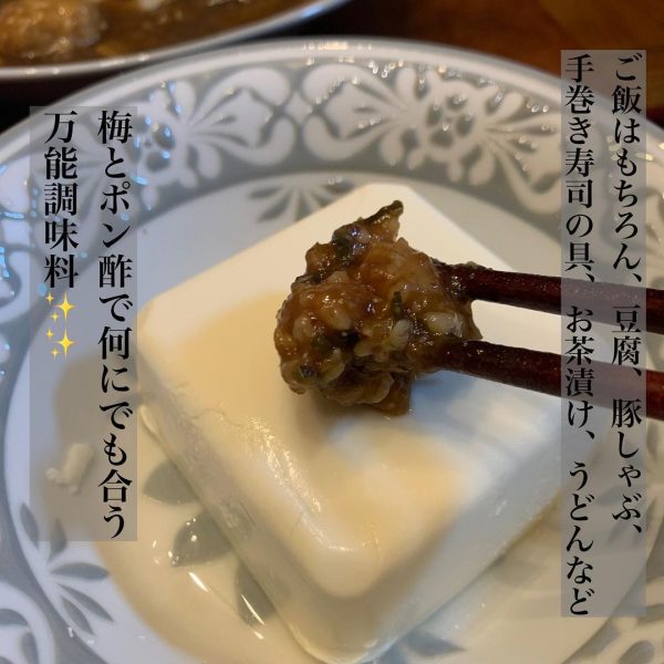 こんな風に「食べる梅ポン酢」をお豆腐にのせたり、ご飯に添えるだけでもいつもと違った味わいが楽しめます。