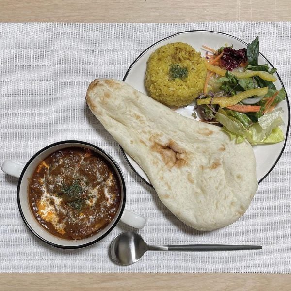 ナンを添えたカフェぽい演出で、見栄えするメニューが出来上がり。