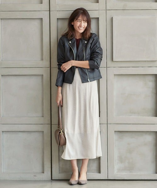 スカートが苦手な大人女子には、ライダースで辛口テイストをミックスするのがおすすめ。