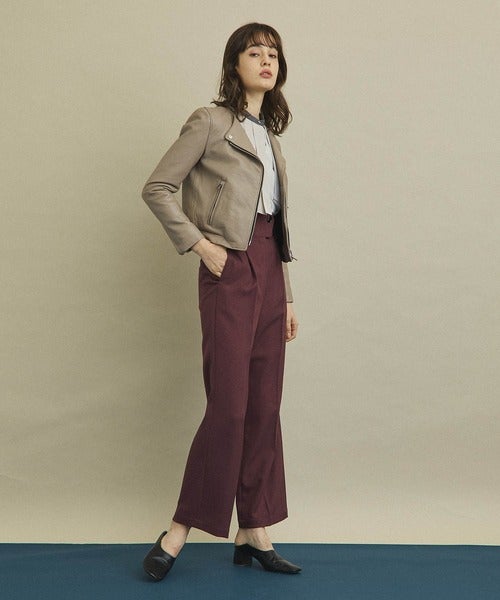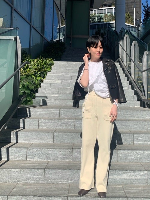 ライダースのコンパクトな身丈生かすため、パンツはハイウエストデザインを選ぶのが◎。