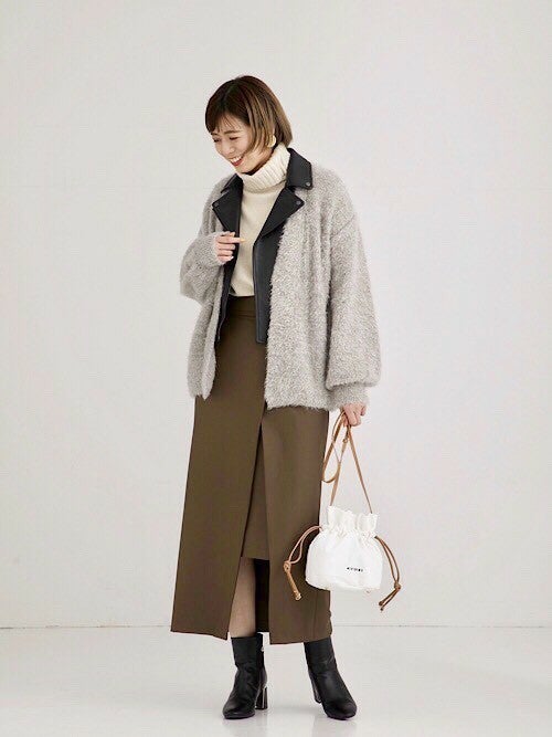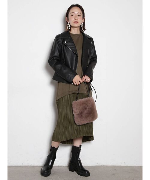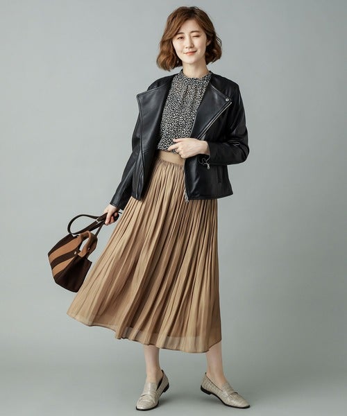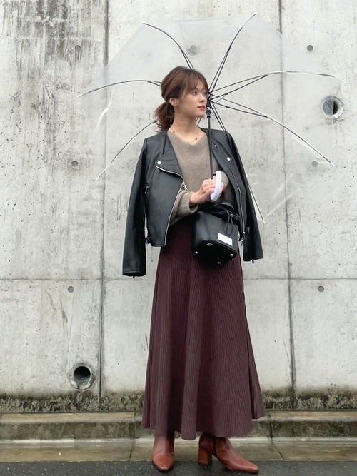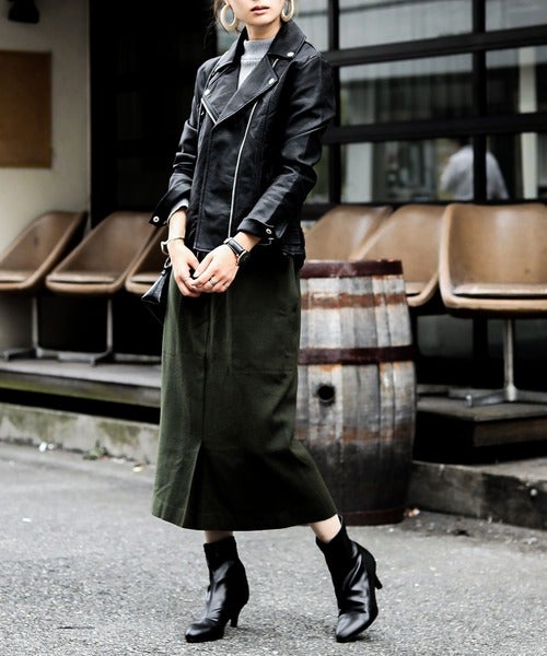 Iラインスカートにライダースを合わせた、スタイリッシュで秋ムードな定番コーディネート。