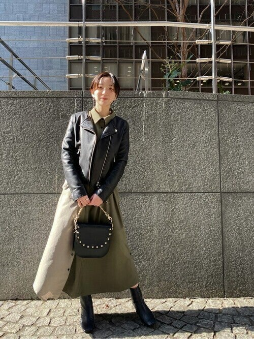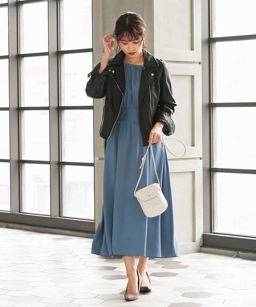 ショート丈のライダースを羽織るだけで、Iラインワンピースでもスタイルアップが可能に。