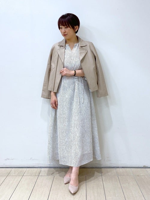 柔らかな色味でフェミニンなワンピースにとても似合う、レディースライクなコーデと好相性なライダースです。