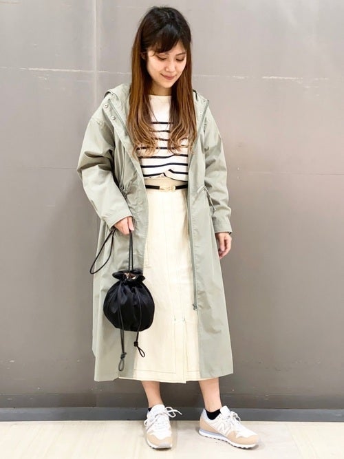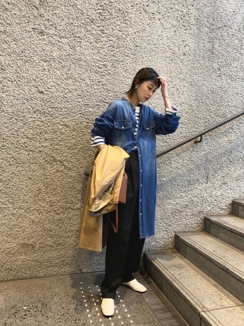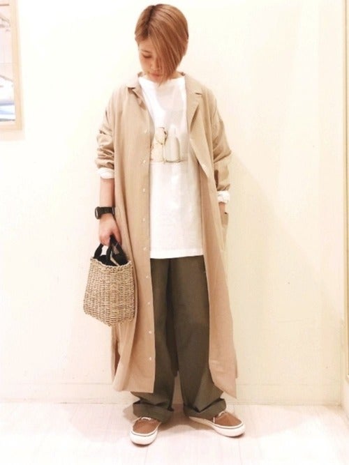 大人女性らしいボーイッシュコーデに見せるポイントは、やはり上から羽織ったライトベージュのオーバーサイズトレンチコート。
