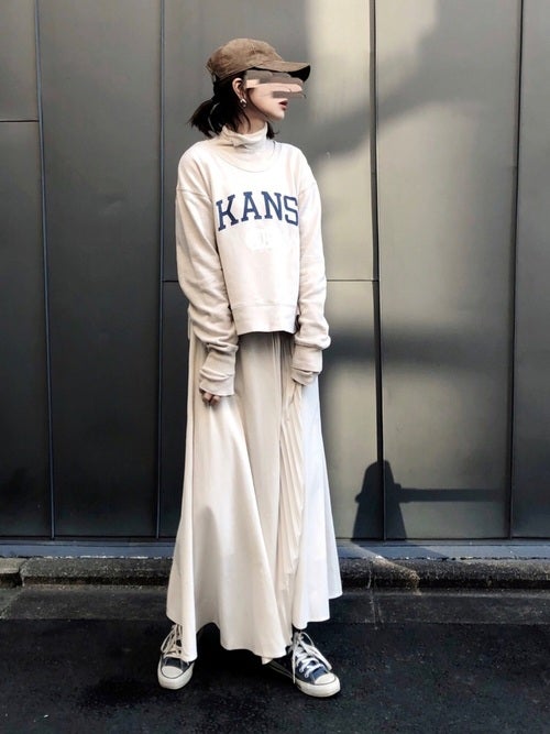 ボーイッシュコーデらしいパーカー+ダッドスニーカーのファッションを、ベージュのワッシャープリーツスカートでほんのりときれいめにアレンジしてみても、2021年春らしくて素敵ですよ。