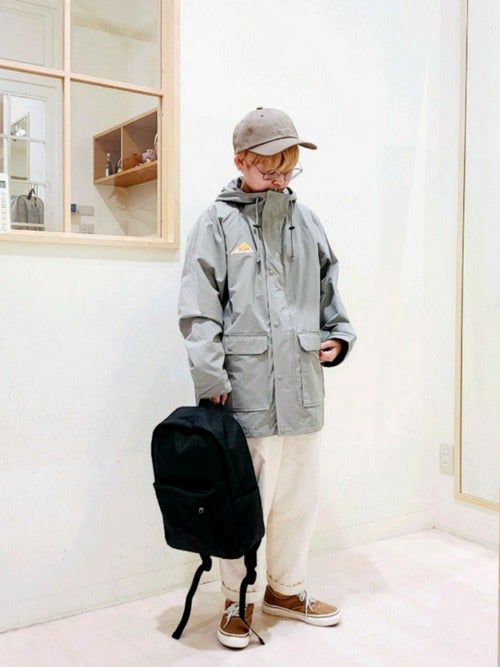 アウターの優しげな色味を活かす白パンツ&茶色スニーカーを組み合わせたら、黒の大きめリュックサックでボーイッシュコーデらしい味付けを加えましょう。
