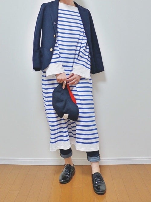 デイリーのボーイッシュコーディネートに大活躍する、レディースのボーダーワンピース&デニムパンツの組み合わせ。