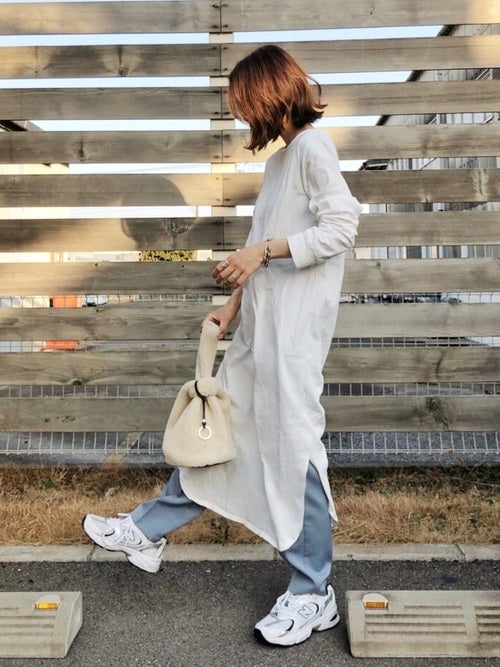 伸縮性抜群のレディースの白カットソーワンピースにブルーのセンタープレスパンツを合わせたファッションは、大人女性に人気のダッドスニーカー合わせで、動きやすさだけでなくトレンド感も意識した服装に仕上げましょう。