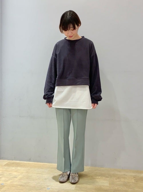 大人女性らしいボーイッシュコーデを追求するなら、まずはトレンドでもあるトップス+スウェットのレイヤードコーディネートに、人気のミントグリーンのセンタープレスパンツを組み合わせたほんのりとスタイリッシュな服装がおすすめ。