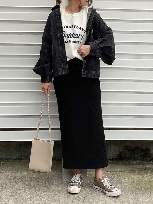 さらにインナーのレディースの白ロゴトップスやベージュのミニショルダーなど、明るさを出してくれるアイテムをバランス良く取り入れて、服装が重くなり過ぎないよう注意しましょう。