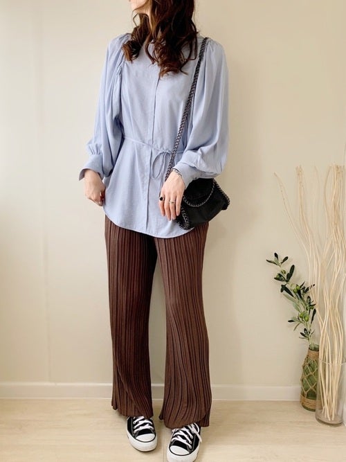 ブラウンのパンツには白やベージュ系のトップスを合わせがちですが、ブルー系を選ぶと爽やかな春らしい装いに。