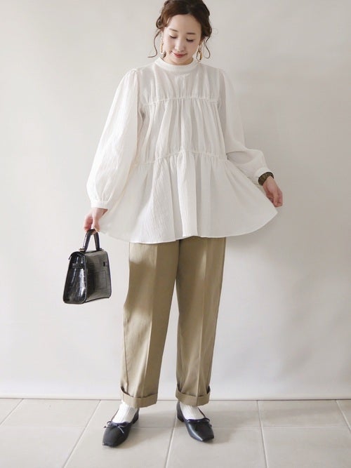 カジュアルに着るのも良いですが、ティアードブラウスを合わせてちょっぴり甘めに仕上げてみてはいかがでしょうか。