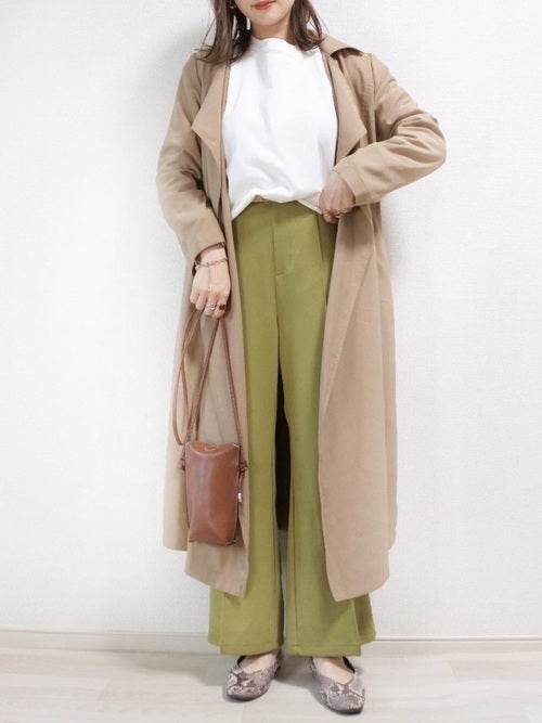 淡いトーンでまとめた春色コーデが映えますね。ポケット付きなのも嬉しいポイント。